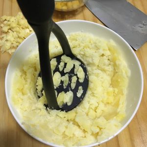 土豆筷子插入很轻松就ok了。放入大一点的碗里,用勺子压成泥,加入黄油,椰浆,黑胡椒,盐拌匀。