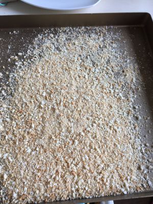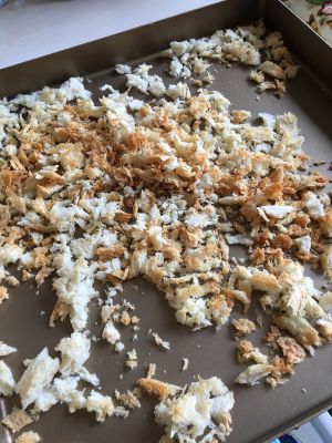 面包去边,撕碎。烤箱160度,不用预热。20分钟左右。