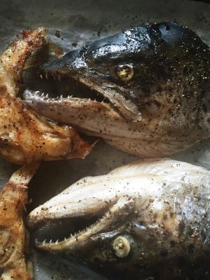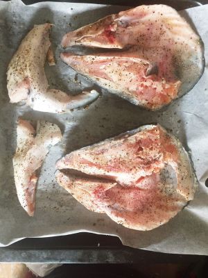 三文鱼头用料酒正反面都淹20分钟以上去腥,两面都撒盐,黑胡椒