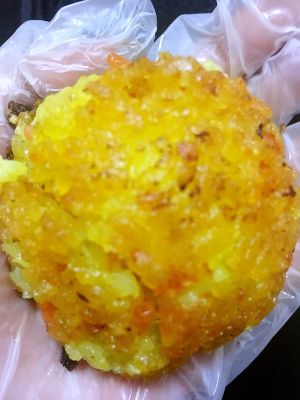 把米饭和三文鱼丁和切碎的洋葱丁捏成团。喜欢的可以加点芝士,烤出来会更香。