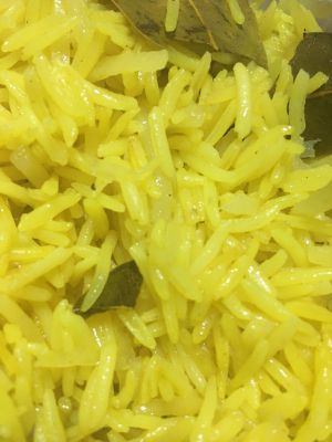 前一天煮的米饭。用的印度米,中东做法。和普通米饭一样,煮之前加一小勺姜黄粉,食盐,橄榄油,月桂叶。其他都和普通米饭一样加水,电饭锅煮熟。
