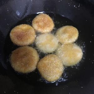 捏出一小块,搓圆后压一下,成饼状,粘满面包糠