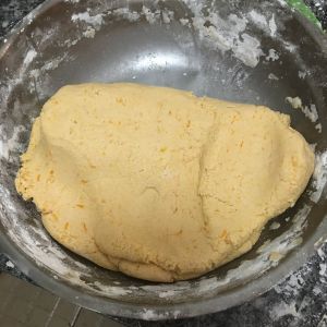 经过多次的揉压,南瓜粉不粘手为标准,就可以压型拉。可以压成喜欢的形状,不要太厚就好。我用保鲜袋做底,南瓜饼就可以轻易拿出来拉