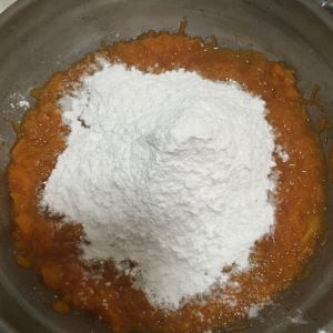 小麦粉和糯米粉拌匀放入南瓜泥和成粉团。