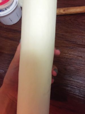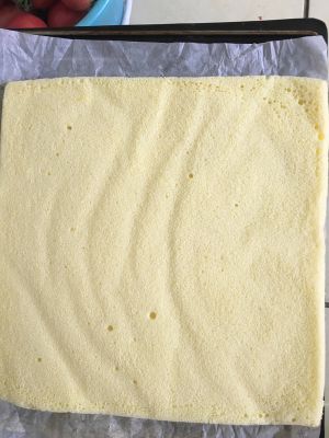 7.烤18分钟左右,表面金黄,出炉,趁热把四遍撕开,倒扣在一张新的油纸上,稍凉一下把油纸撕下,再盖回蛋糕上,防止过干开裂。 8.淡奶油加糖打到全发,均匀涂抹在蛋糕上,有一边留出一些空隙,那边的奶油也抹薄一些。