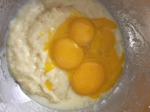 1.玉米油和牛奶先搅拌均匀,避免油水分离,加入过筛的低筋面粉,搅拌均匀,加入蛋黄搅拌均匀,待用…………