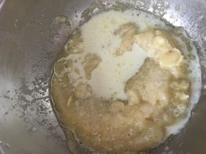 依次加入油,纯牛奶,面粉。加一样东西,打发几下,打发到无颗粒