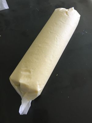 5.烤好取出烤盘,距离桌面10公分震出空气,取出倒扣放凉,手碰蛋糕余温时候抹上沙拉酱,用擀面杖把蛋糕卷起来,收口包好,冷藏4小时以上,再拿出来切块