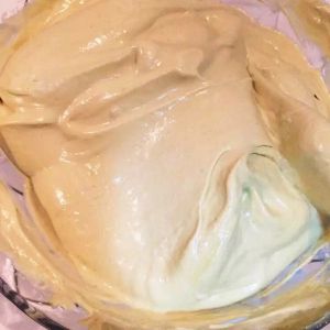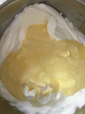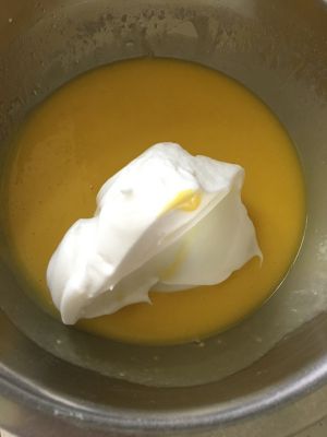 烤箱可以开始预热,175上下火。把蛋白分三次加入蛋黄中,搅拌的时候要注意不要用力过猛,不要转圈搅拌会消泡,要上下