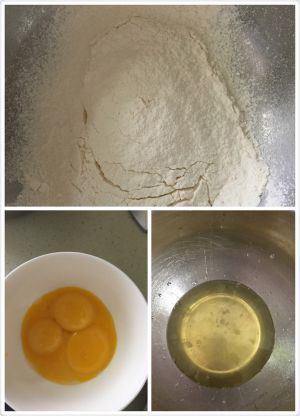 1.蛋黄蛋清分离,分别放入无水无油的干净打蛋盆中。 2.蛋黄盆里加入油和牛奶搅拌均匀,再混合筛入低粉和玉米淀粉。用手动打蛋器划"之"字形搅拌均匀,做成图片样的蛋黄糊。
