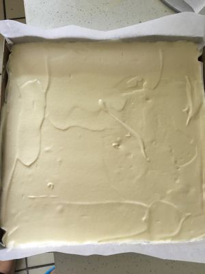 3.蛋白打发好分三次加入面糊,用翻板手法混合面糊(切记不能画圈混合面糊)倒入9寸方盆(24*24方盘)烤盘铺油纸