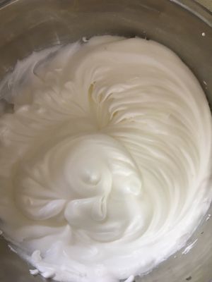 2.打发蛋白(盘子必须无油无水)加入白醋或者柠檬汁2滴(去腥味),白砂糖分3次加入,二档打发至大泡加入第一次白砂糖,继续打发,打发至密集小泡加入第二次白砂糖,持续打发至有纹理加入玉米淀粉和剩余白砂糖,3挡打发至清晰的纹路,再转一档打发20秒,成硬性尖角状态