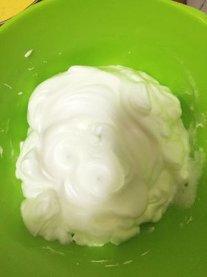 蛋白打发,分次放入40g白砂糖,打发到成勾,干性