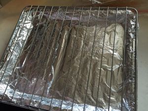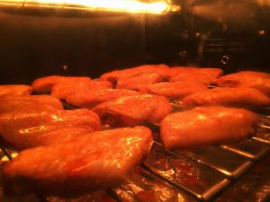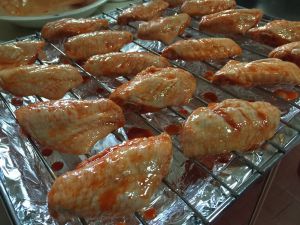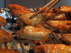 拿出来,给鸡翅翻面,刷上油,蜂蜜,烤肉酱
