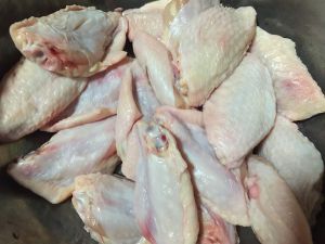 鸡翅根买回家是冰冻的,解冻后,洗净并焯水去血水腥味。