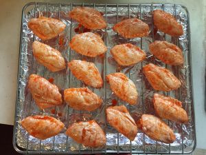 因为是第一次做,而且就我们两个人,所以我只烤了6个。先把鸡翅洗干净,在正反两面各划两刀,以便腌料能够更入味。把腌料抹匀在鸡翅上,(也可用适量水和腌料拌匀,把鸡翅泡在里面,下次用这个方法腌了试试,)然后用保鲜膜把碗包上,放入冷藏腌上6到24小时,我是腌了一个晚上,早上起来烤的