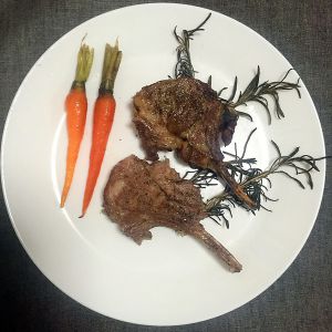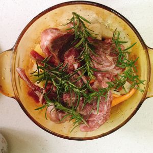 撒上盐和少量的胡椒粉,放入盛放羊排的容器中,加强洗净的迷迭香,盖好盖子