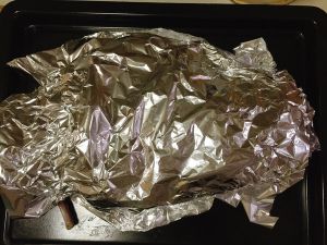 腌制两小时后,用锡纸包裹起来,放入预热好的烤箱230度,20分钟