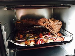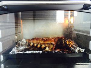 从烤箱中取出羊排,用筷子扎一下能很容易扎透即可,这时候的肉比较软烂。将羊排放到烤架上,入烤箱(蔬菜在下层,羊排在上层,羊排上烤出的肉汁可以进去配菜)
