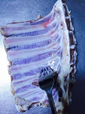 羊排洗净,根部不要切断,肋骨之间切开。烤盘放锡纸,羊排放好。