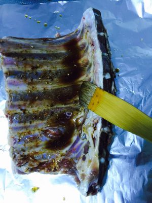 用生抽、孜然粉、花椒粉、蜂蜜或白糖、鸡精调成料汁,均匀涂抹在羊排上。