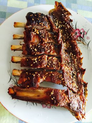 装盘,配上一点椒盐和蒜瓣,一盘香喷喷的新疆风味的烤羊排就做好了。