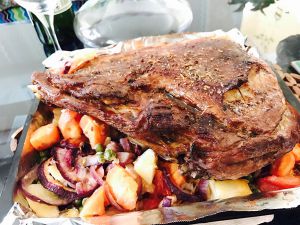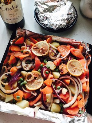 烤羊排的时候准备配菜。将胡萝卜,土豆去皮切成小块,用水焯至七成熟。锅中放入黄油(不喜欢黄油的味道可用橄榄油),放入沥干水份的胡萝卜,土豆;青豆,洋葱,西红柿进行翻炒,放入少量黑胡椒和盐,出锅放入烤盘备用。放上几片柠檬。为了增加香味可放少量红酒。(蔬菜喜欢的都可放入)