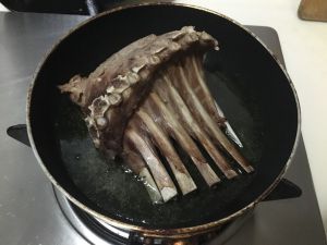 大火煎至羊排油皮金黄酥脆,其他几个面也要逐一翻面煎炸。