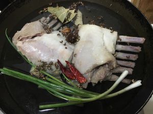 焯烫过的羊排,加清水、葱姜、花椒、辣椒、香叶、香果煮熟。加盐,汤汁稍咸,这样羊肉才能入味。