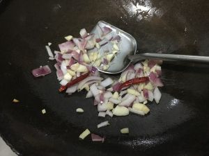 煎好羊排的油再炒些洋葱、大蒜和辣椒,做配菜,