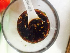 蚝油和生抽三比一的配比倒入小碗,基本上根据个人口味轻重放入,蒜切碎,放一点黑椒和孜然,香葱切一些,鸡精放入,把这些料都和起来