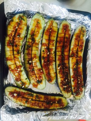 烤盘铺锡纸放入茄子,上面刷一些油,再把刚刚的料浇一些,别浇太多会咸,匀了就好