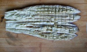 烤箱时间到后取出茄子,从中间剖开,注意不能切断,再拿到在茄子肉上竖着划几刀方便入味,同样小心别切到底