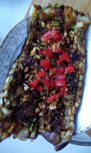 辣椒、蒜、葱切细均匀的撒在茄子上,抹上肉酱,用小勺把酱油均匀的撒在茄子上,放入微波炉微波5分钟后,放入番茄粒再微波20秒,美味茄子就成功出炉了。