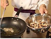 锅内下30克色拉油,大火将油烧至7成热,放入裹好淀粉的排骨,炸成金黄时捞出待用。