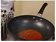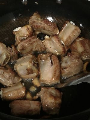 锅内放适量的油。不要太多。免得太油腻。下排骨。煎至变色。加姜蒜。倒入汁。翻炒均匀。