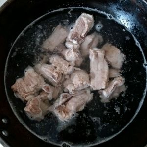 锅内加水烧开,放入排骨,撇去浮沫,焯净血水,捞出控水备用。