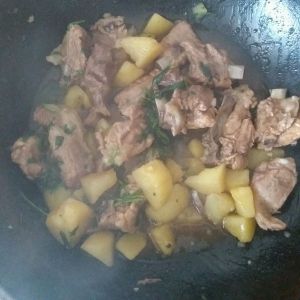 排骨肉烂了放入土豆同时放盐,直到土豆熟透,放入香菜,翻炒,出锅即可