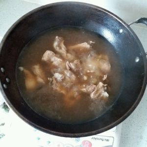 加水。沒过排骨。加盐。加大料。去肉腥。一直中火炖40分钟。最后大火收汁。可见汤内的汤稀出。越来越弄。即可挂色