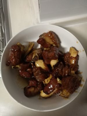 油下锅,排骨翻炒至焦色,加酱汁,大火收汁。