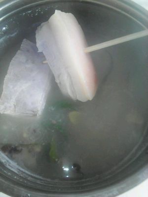 五花肉洗净,放入锅中加姜蒜,煮至筷子轻轻插透即可。