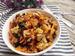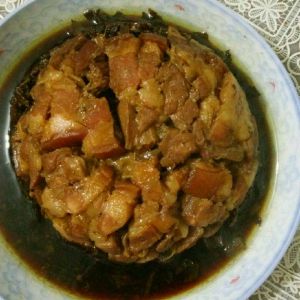 将盘子盖在碗上,将碗翻过来,就变成了肉在上面,梅干菜在最底下,梅干菜不建议当菜吃,吸收了肉的油脂,而且容易上火。