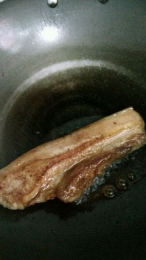 将剩下的一块扣肉切成小块,锅里热油后放入锅内煎,盖上锅盖煎至表面金黄即可