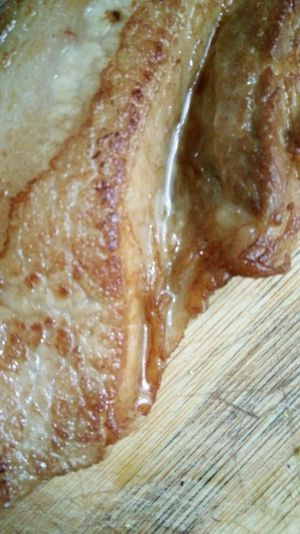 放油,油温六十度时,肉皮朝下放入,注意油溅,然后关小火,时不时翻动,炸大概二十多分钟。
