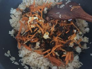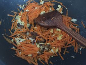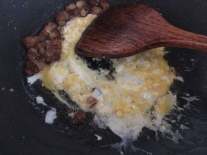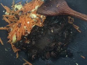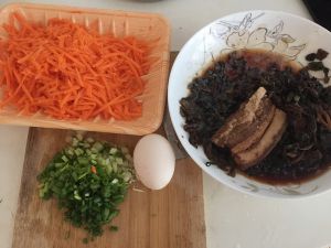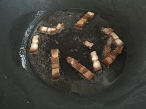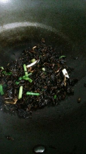 用煎肉的油锅加热,放生姜,梅干菜,葱,炒干梅干菜的水份,散发香味后起锅。