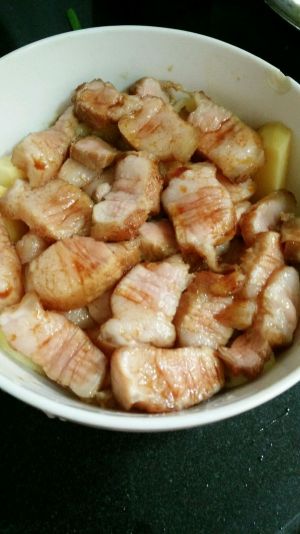 把切好的五花肉摆在碗里,特意切小点,小朋友可以一口吃完,酱油先倒在勺子上,再均匀洒在肉上,我洒了3勺,加冰糖,喜欢甜的可多加点。