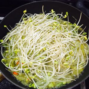放入豆芽同煮至汤出色,(我爱吃豆芽,买了半斤,也可改其他爱吃的配菜)