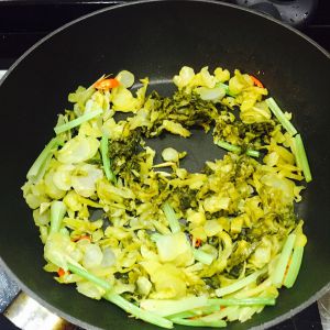 热锅热油爆香葱和干辣椒,加入切好的酸菜,一起翻炒3分钟。