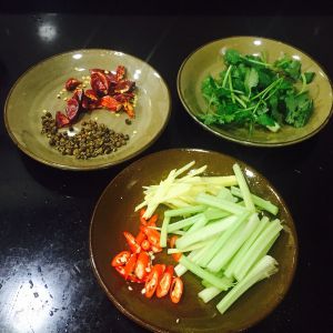 姜切丝,小米椒切碎,香芹切段,香菜切段。干辣椒、花椒略洗沥干。