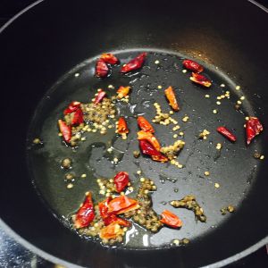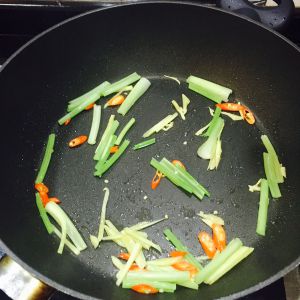 锅中热油,酸菜翻炒,加入切段的红辣椒,花椒少许。